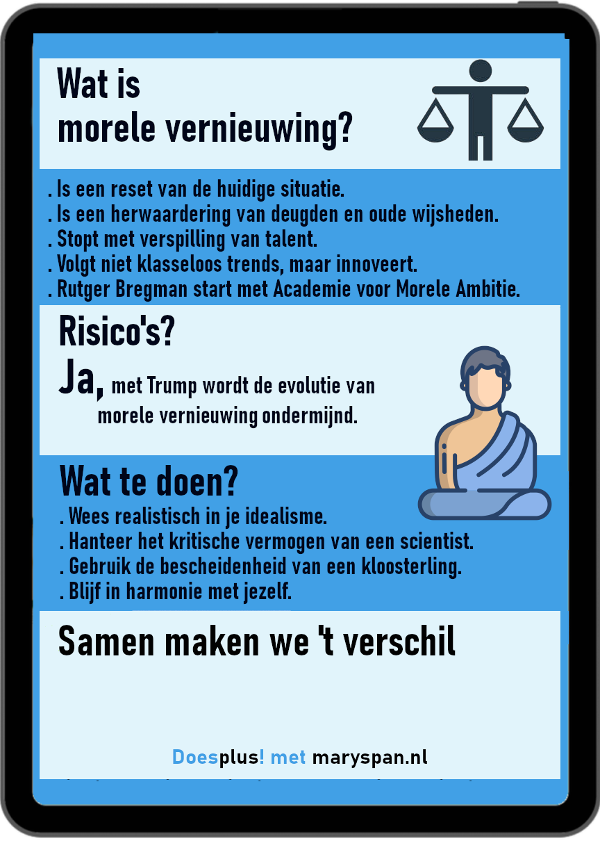 Volgens Rutger Bregman is morele ambitie zelfs het medicijn voor evolutie. Bregman ziet een grote rol weggelegd voor actieve mensen, leiders en ondernemers, als ze tenminste de juiste prioriteiten stellen. Dat wil zeggen dat ze de wil hebben om tot de beste te horen en dat ze gewijd zijn aan de beste oplossingen voor de wereld. Dat betekent dat er werk aan de winkel is. Niet minder, maar misschien wel meer. Het is tijd om de lat hoger te leggen, niet alleen voor onszelf, maar ook voor onze leiders.